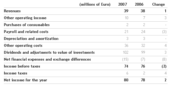 The Board then approved the draft financial statements of the Parent Company(1), with net income of 80 million euro, and a proposal to the next Shareholders' Meeting for payment of a dividend totalling 73 million euro, equivalent to 0.40 euro per share (0.37 euro per share in 2006), confirming a pay-out ratio equivalent to 50% of consolidated net income. The dividend is expected to be payable from 8 May 2008, with coupon detachment date 5 May 2008.