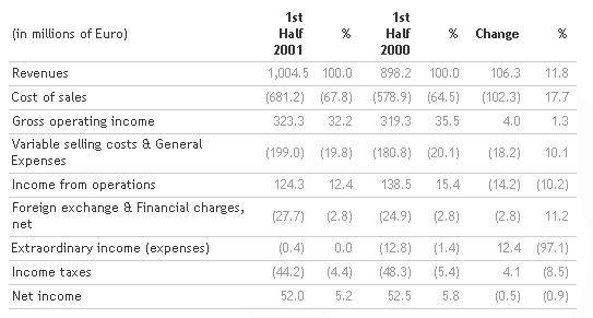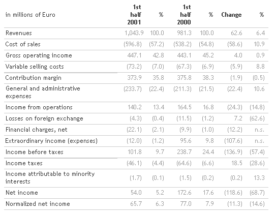 The first half of 2001 produced consolidated revenues of 1,044 million euro, with an increase of 6.4 per cent compared with the same period in 2000 (981 million euro). The increase, which confirms the positive trend for the year, was achieved in spite of ever greater competition in the sector and, in general, the slow-down in the growth rate of the world economy. The result was influenced by the unsatisfactory trend in the sports sector, in which turnover for the half year was down by around 15 million euro, although this was a better than average performance for the sports equipment market in Europe.