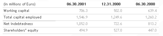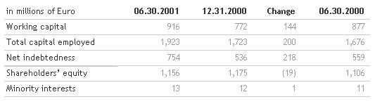 In the first half of the year, dividends were paid totalling 84 million euro and significant investments were made exceeding 143 million euro, of which over 90 million (in addition to around 390 million invested in previous financial years) was dedicated to the purchase, modernisation and restoration of buildings, with the objective of further increasing the area destined for commercial use. As a result of these items and of the seasonal nature of the business, net debt rose to 754 million euro, from 536 million euro at the end of the 2000 financial year, with a forecast reduction, by the end of the year, to 650-700 million euro. Shareholdersâ equity at 30 June 2001 was 1,156 million euro against 1,175 million at the end of the 2000 financial year, taking into account the above-mentioned distribution of dividends.