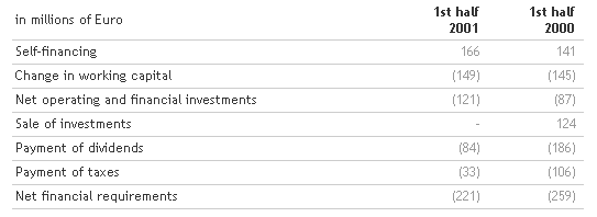 Normalized net income, which excludes net extraordinary expenses, was more than 65 million euro in the first half of 2001 against 77 million euro in the first six months of 2000 (normalized, in particular, for capital gains resulting from the sale of Benetton Formula). Gross operating income was 447 million euro against 443 million in the first half of 2000; income from operations, of 140 million euro, was 13.4 per cent of turnover. Self-financing generated was 166 million euro, more than 25 million euro higher than the previous year.
