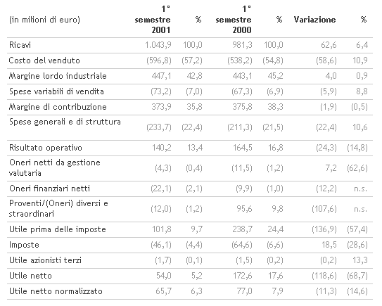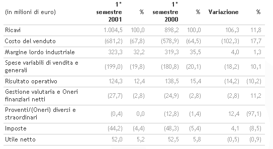Il primo semestre 2001 presenta ricavi consolidati pari a 1.044 milioni di euro, con un aumento del 6,4 per cento rispetto all’analogo periodo del 2000 (981 milioni di euro). La crescita, che conferma il positivo trend dell’anno, è stata realizzata nonostante la sempre maggior competitività del settore e, in generale, il rallentamento del tasso di sviluppo dell’economia mondiale. Il risultato è stato influenzato dall’andamento non soddisfacente del settore sportivo, il cui fatturato è diminuito nel semestre di circa 15 milioni di euro, pur riuscendo a esprimere performance superiori alla media del mercato degli attrezzi sportivi in Europa.
