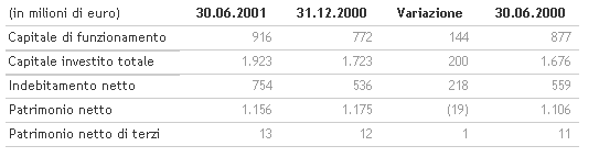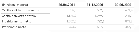 Nel primo semestre dell’anno sono stati pagati dividendi per complessivi 84 milioni di euro e sono stati effettuati rilevanti investimenti, per più di 143 milioni di euro, di cui oltre 90 milioni (che si aggiungono ai circa 390 milioni investiti negli scorsi esercizi) sono stati dedicati ad acquisizione, ammodernamento e riqualificazione di immobili, con l’obiettivo di ampliare ulteriormente le superfici destinate alle attività commerciali. In considerazione di queste componenti e della stagionalità del business, l'indebitamento netto è salito a 754 milioni di euro, dai 536 milioni a fine esercizio 2000, con una previsione di ridimensionamento, a fine anno, a 650-700 milioni di euro. Il patrimonio netto al 30 giugno 2001 si è attestato a 1.156 milioni di euro, contro 1.175 milioni a fine esercizio 2000, tenuto conto della summenzionata distribuzione di dividendi.