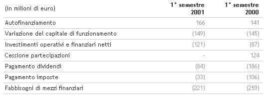 L'utile netto normalizzato, che esclude gli oneri straordinari netti, si attesta nel primo semestre del 2001 a oltre 65 milioni di euro contro 77 milioni di euro nei primi sei mesi del 2000 (normalizzati, in particolare, dalle plusvalenze derivanti dalla cessione di Benetton Formula). Il margine lordo industriale è pari a 447 milioni di euro contro 443 milioni del primo semestre del 2000; il risultato operativo, pari a 140 milioni di euro, si attesta al 13,4 per cento del fatturato. L’autofinanziamento generato è pari a 166 milioni di euro, in aumento di oltre 25 milioni di euro rispetto allo scorso anno.